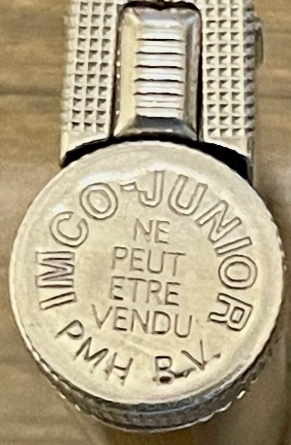 El encendedor es un IMCO Junior promocional fabricado entre los años 50 y 70, probablemente para Philip Morris Holland B.V., (1969) distribuido como obsequio en campañas de cigarrillos. Es un artículo coleccionable con un valor interesante, especialmente por la inscripción “Ne peut être vendu” que confirma su origen publicitario.